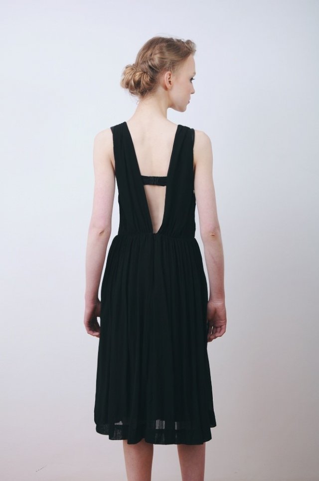 Elegancka, stylowa, minimalistyczna szyfonowa sukienka z głębokim dekoltem i wycięciem na plecach, zapinana z tyłu na zamek, odcinana pod biustem. Posiada podszewkę. Marka: Kate Moss dla Topshop.