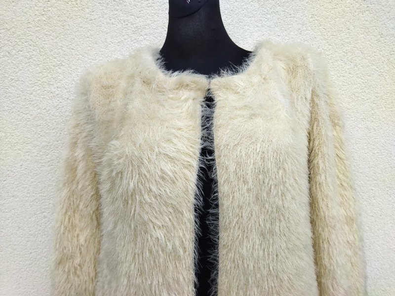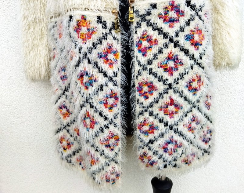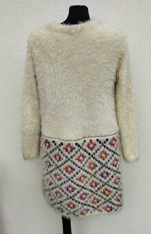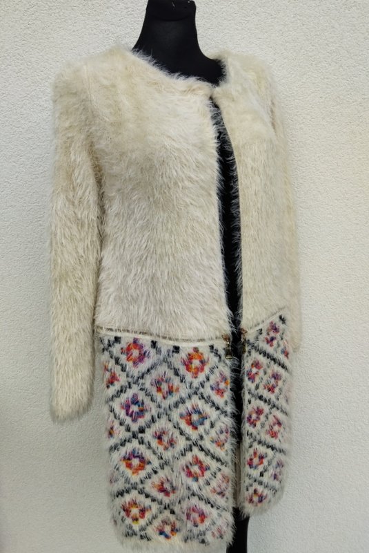Miły puszysty sweter z trawiastej akrylowej włóczki w śmietankowym kolorze z wzorzystym dołem w kolorowe kwiatowe wzory z gładkiej włóczki ( bez trawki) połączonym z góra poziomo wszytym zamkiem. fason otwarty - bez zapięcia. Ładniejszy w realu.