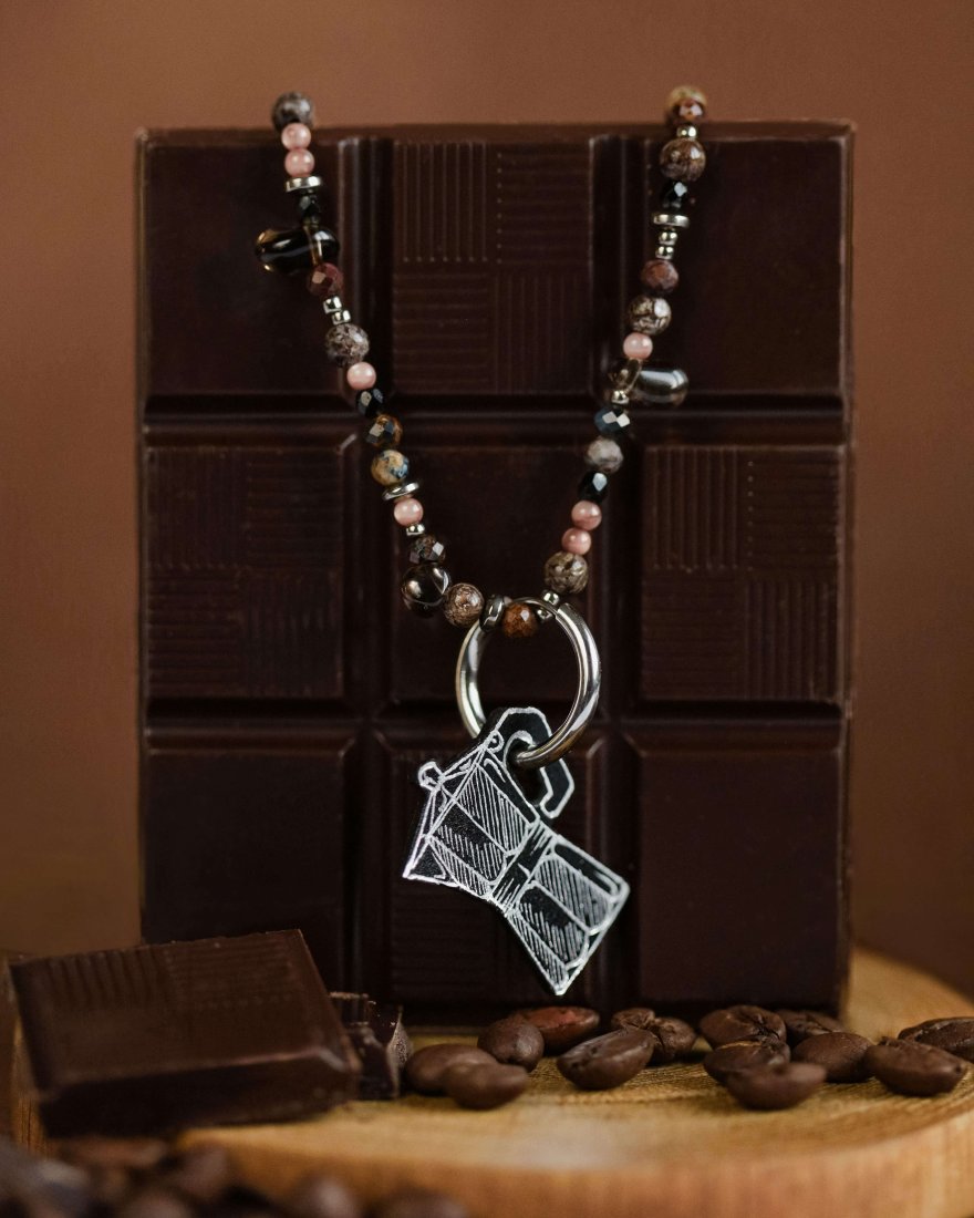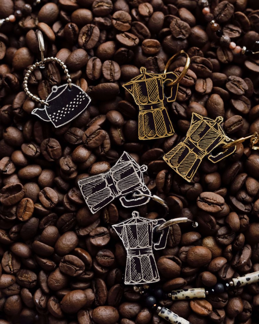Zawieszka w kształcie kawiarki wykonana ze skóry naturalnej, zdobiona ręcznie wykonaną metaliczną ilustracją. Można ją nosić jako pojedynczy kolczyk, jako wisiorek do ulubionego naszyjnika albo charms do torebki.