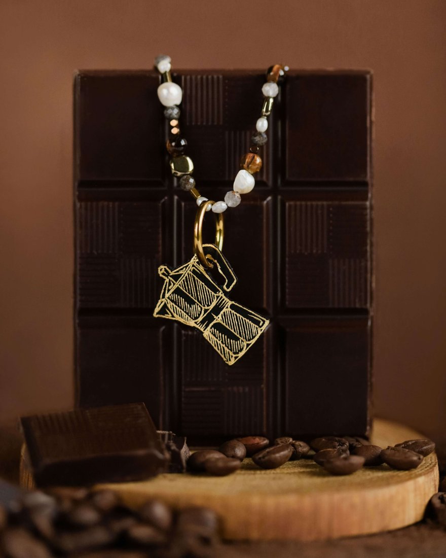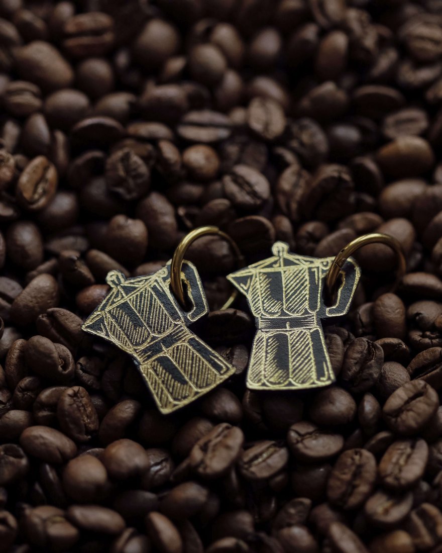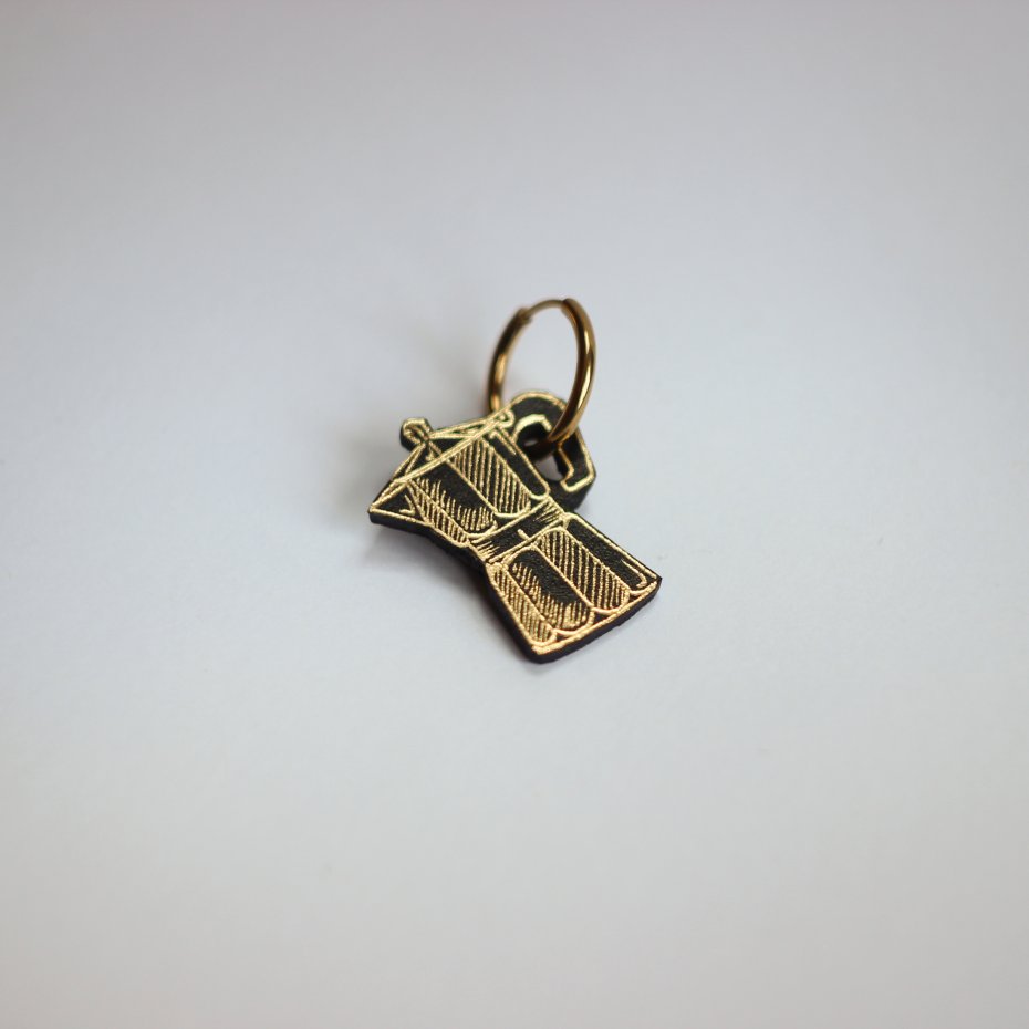 Zawieszka w kształcie kawiarki wykonana ze skóry naturalnej, zdobiona ręcznie wykonaną metaliczną ilustracją. Można ją nosić jako pojedynczy kolczyk, jako wisiorek do ulubionego naszyjnika albo charms do torebki.