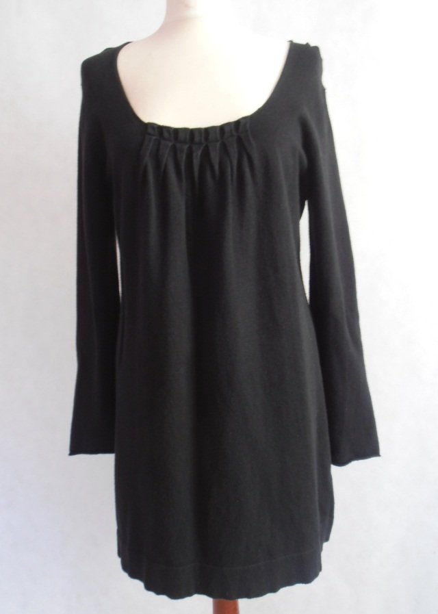 Bluzka-tunika firmy kello.Rozmiar 14,nasz 40-42.Materiał zbity-45% jedwab+25% wiskoza+25% bawełna+5% spandex.Dekolt okrągły z przodu zaszyte zakładki.Rękaw długi,lekko zwężający się.Stan ogólny dobry+.Długość 84 cm.pod pachami 108 cm.