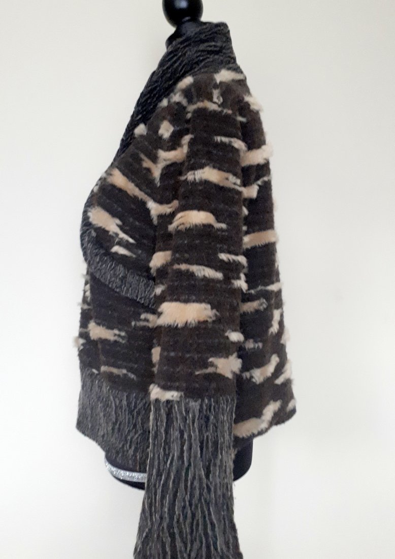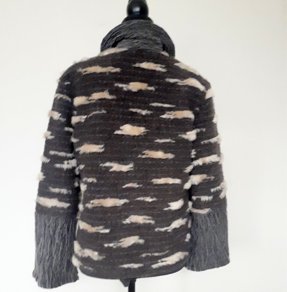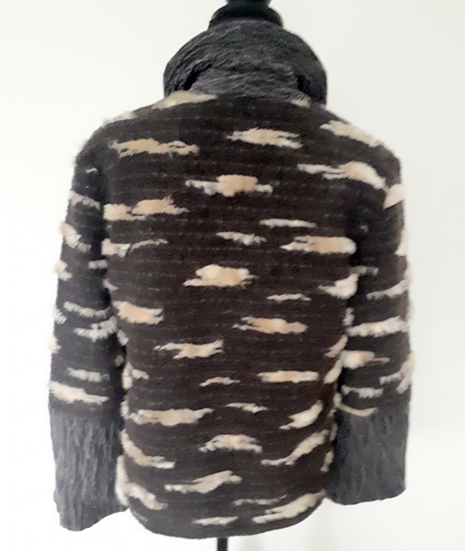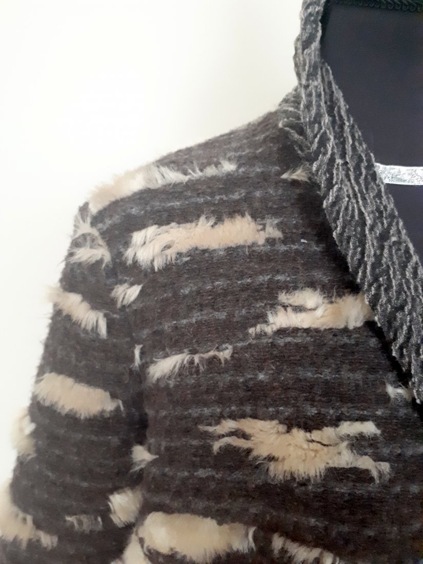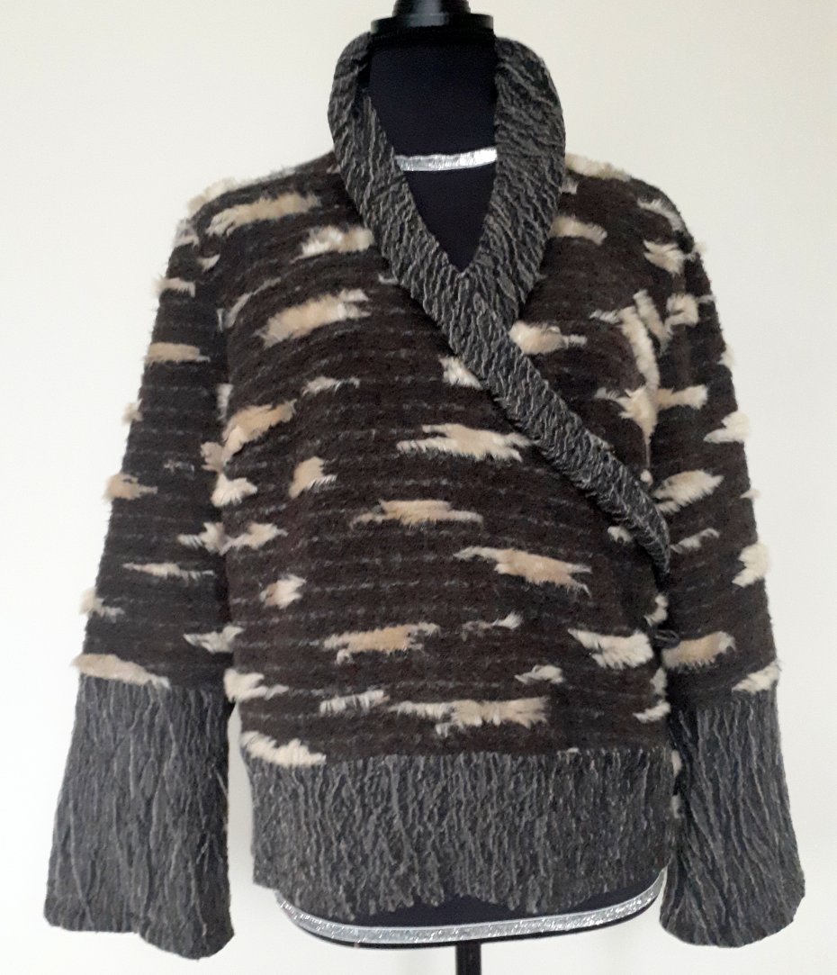 Ciepła, kopertowa bluza z szalowym kołnierzem i jasnobeżowymi paskami futerka po całości, kołnierz mankiety i dół przodu doszywane z marszczonej tkaniny.