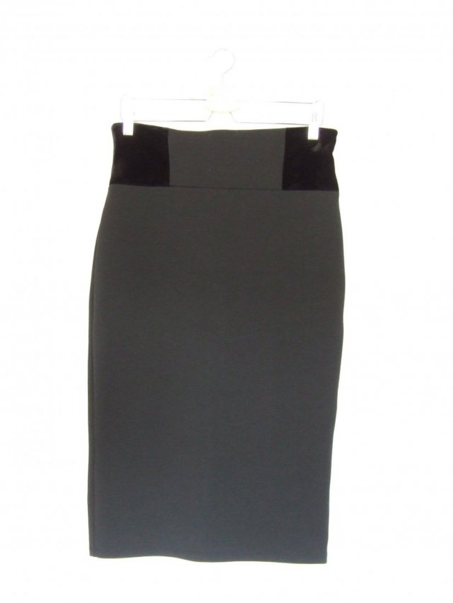 Elastyczna ołówkowa czarna spódnica z aksamitnymi wstawkami po bokach, z tyłu zapinana na złoty metalowy zamek.