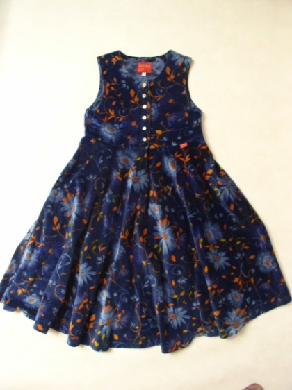 Sukieneczka dziecięca firmy KENZO.Made in France.Materiał aksamit 100%bawełna.Rozmiar na 128 cm. na 8 lat.Odcięta w pasie.Staniczek zapinany na 6 małych guziczków.Spódniczka mocno rozkloszowana.Logo firmy w szwie łączącym górę ze spódnicą i w górnej części.Stan bardzo dobry.Długość 80 cm.pod pachami 68 cm,pas 68 cm.
