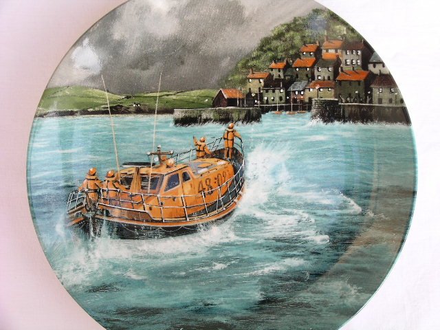 Unikatowy na rynku polskim kolekcjonerski, porcelanowy talerz z Limitowanej serii produkowanej tylko przez 21 dni. Talerz ze swoim indywidualnym numerem, sygnowany jakością Minerva Ware Crown Staffordshire England z serii HEROES OF THE SEA; trzeci talerz z serii Safe Return malowany przez Kavina Platta. Rarytas. 20 x 2 cm.