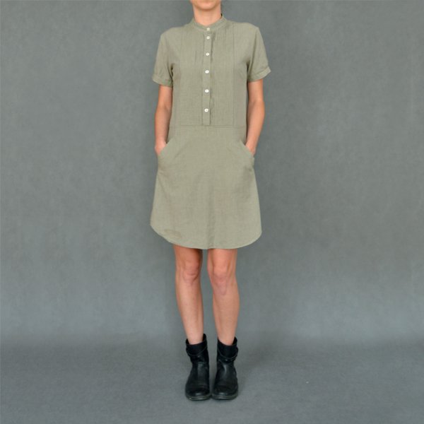 Sukienka w bardzo delikatnym i jasnym kolorze khaki. Krój dość prosty, po bokach kieszenie. Góra na guziczki, po bokach ozdobiona zaszywkami. Bez podszewki. Polecam.