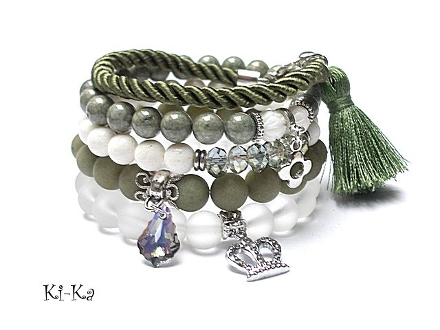PROJEKT AUTORSKI. WŁASNOŚĆ KI-KA. KOPIOWANIE -ZABRONIONE. Komplet pięciu bransoletek wykonanych z naturalnych minerałów: jadeity matowe [10mm], naturalny koral [8mm], kryształków [6 x 8mm], naturalnego, rzeźbionego korala [8mm], jaspisu [8mm], matowego szkła [10mm], satynowej liny i chwosta, kryształka Swarovskiego w kształcie kropli barokowej oraz elementów metalowych w kolorze srebrnym Bransoletki pasują na nadgarstek 16-17cm. Biżuteria ozdobnie zapakowana