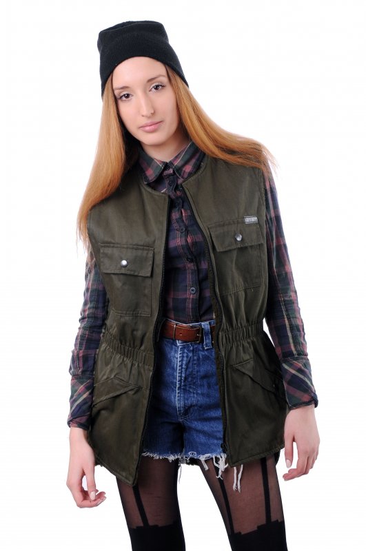 Ocieplana kamizelka w kolorze khaki zapinana z przodu na zamek. Posiada dłuższy tył, kieszenie zapinane na napy na wysokości biustu i na dole. W pasie gumka dzięki czemu fajnie dopasowuje się w talii. Fajnie wygląda do skórzanej kurtki:) Marka: Lei Jona P