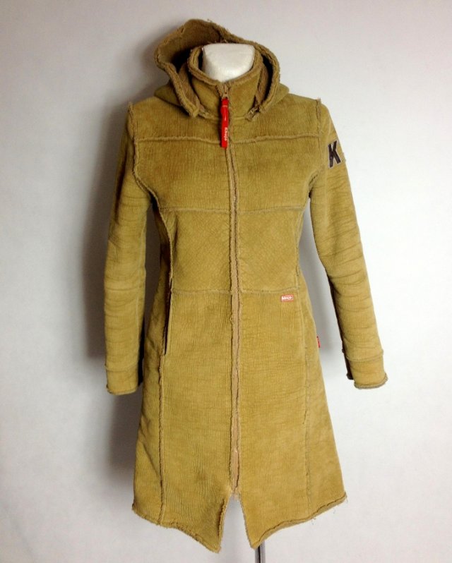 Markowy zimowy płaszcz znanej premium marki Khujo .Logowany . Rozmiar z metki S. Płaszcz ma fason rozkloszowany, jest zasuwany na suwak, kaptur można zdjąć (odsuwany ).Po bokach posiada kieszenie, na lewym ramieniu logo marki (litery), na dole poniżej pasa czerwona plakietka z logo marki.Od wewnątrz płaszcz na kożuszku, materiał z zewnątrz przypomina bardzo gruby sztruks.