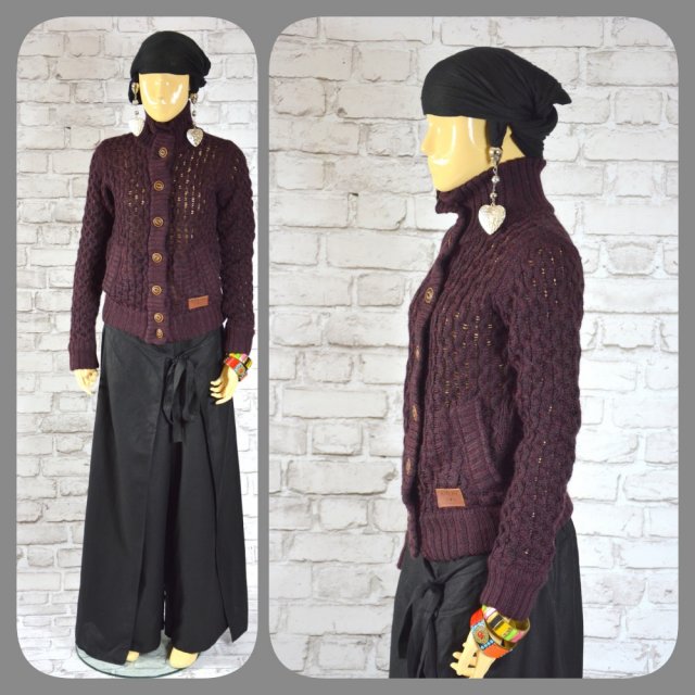 Świetny ciepły sweter marki KHUJO o dopasowanym kroju -kolor coś w stylu ciemnej śliwki, sweterek zapinany na duże logowane guziki, posiada wysoki kołnierz, po bokach posiada kieszonki, z przodu przy jednej z kieszeni naszyte skórzane logo marki, z tyłu przy linii karku również markowa naszywka.