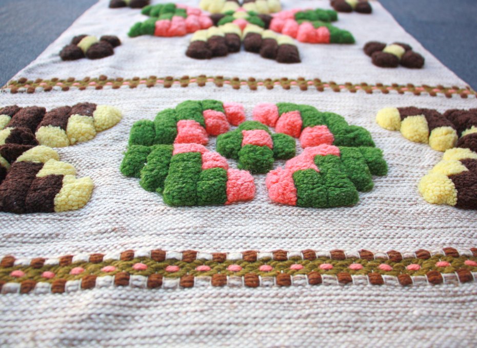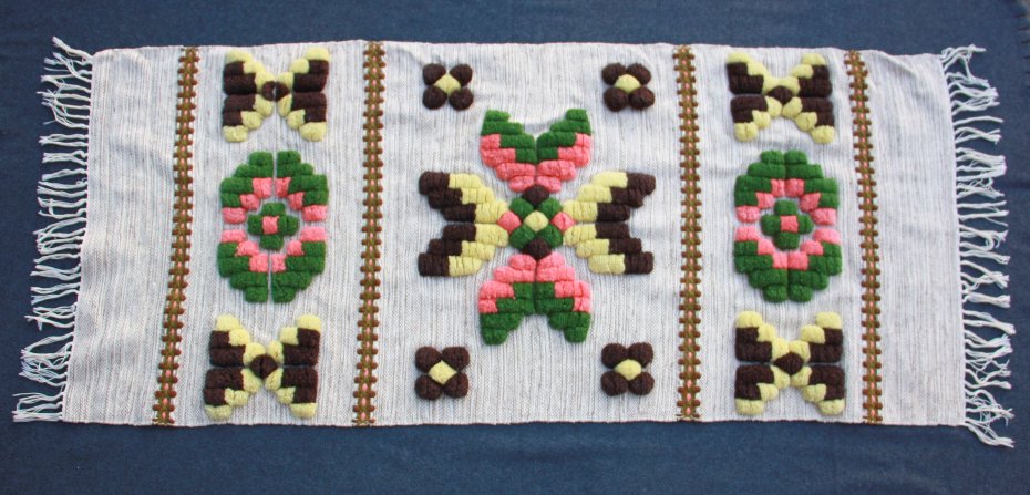 Ręcznie robiony kilim, makatka. Może być użyty jako dekoracyjny bieżnik lub chodniczek. Dekoracyjny wzór jest mocno wypukły - ponad 1 cm. Oryginalne rękodzieło szwedzkie. Wymiary: długość z frędzlami 140 cm, długość tkaniny bez frędzli 125 cm, szerokość 56 cm.