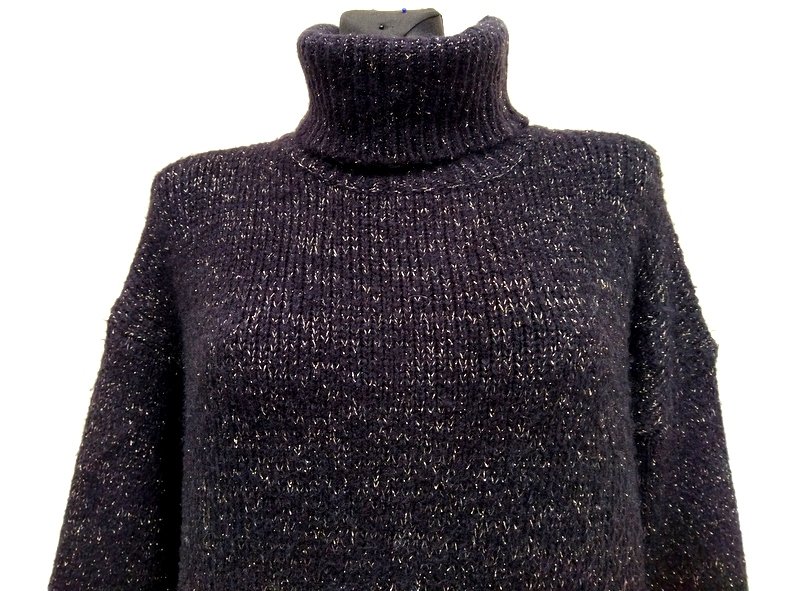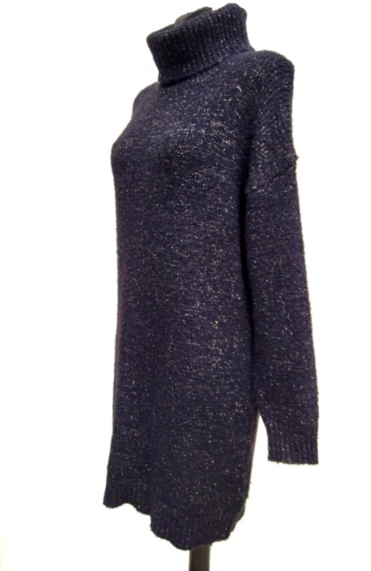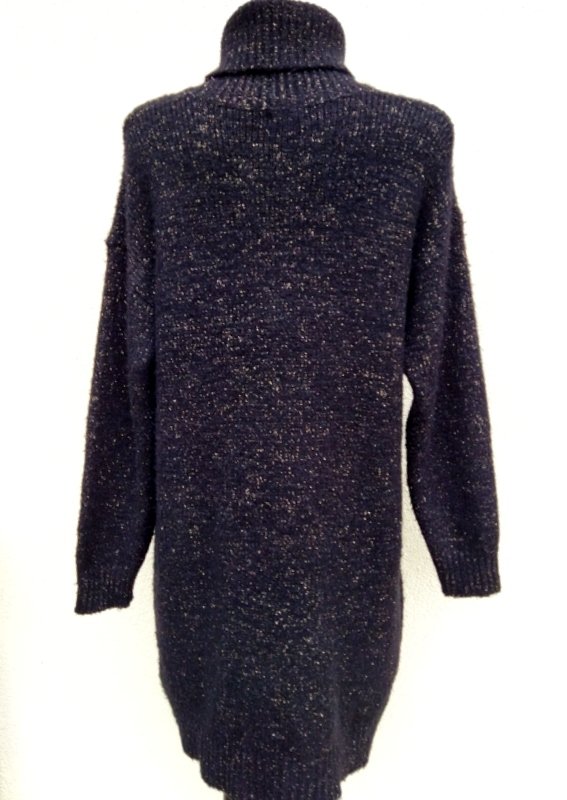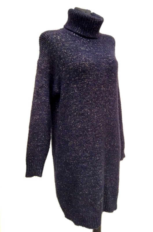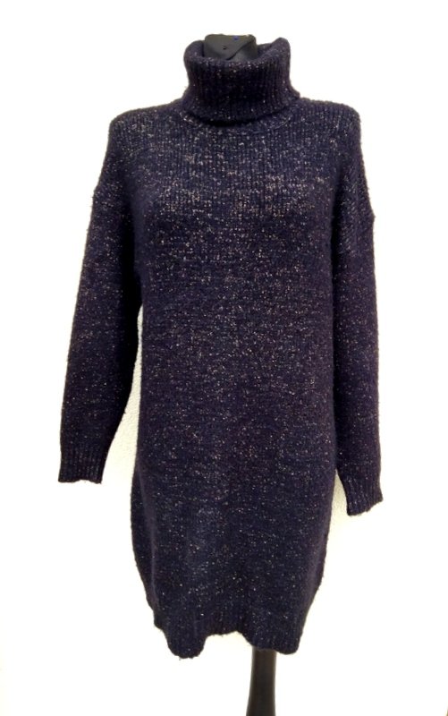 Miła rozciągliwa sweterkowa sukienka w czarnym kolorze z wpleciona dyskretna złota nitka.Z golfem . Wykończona ściagaczami.