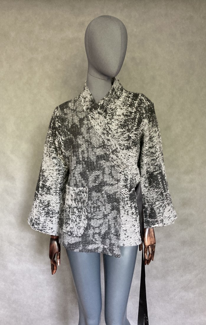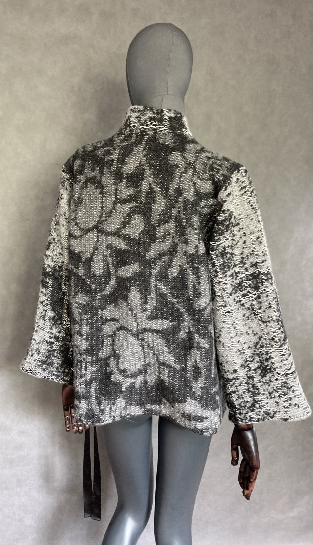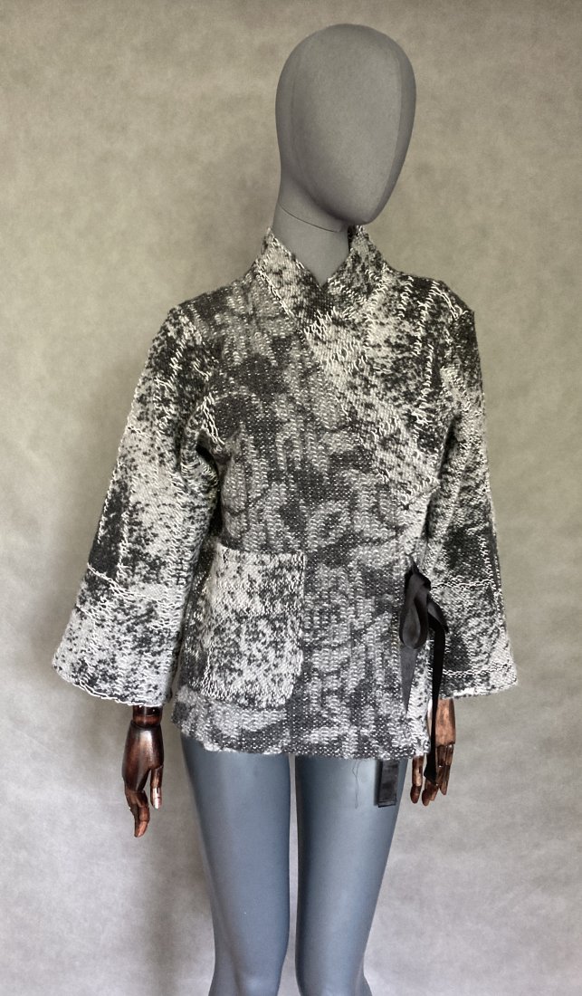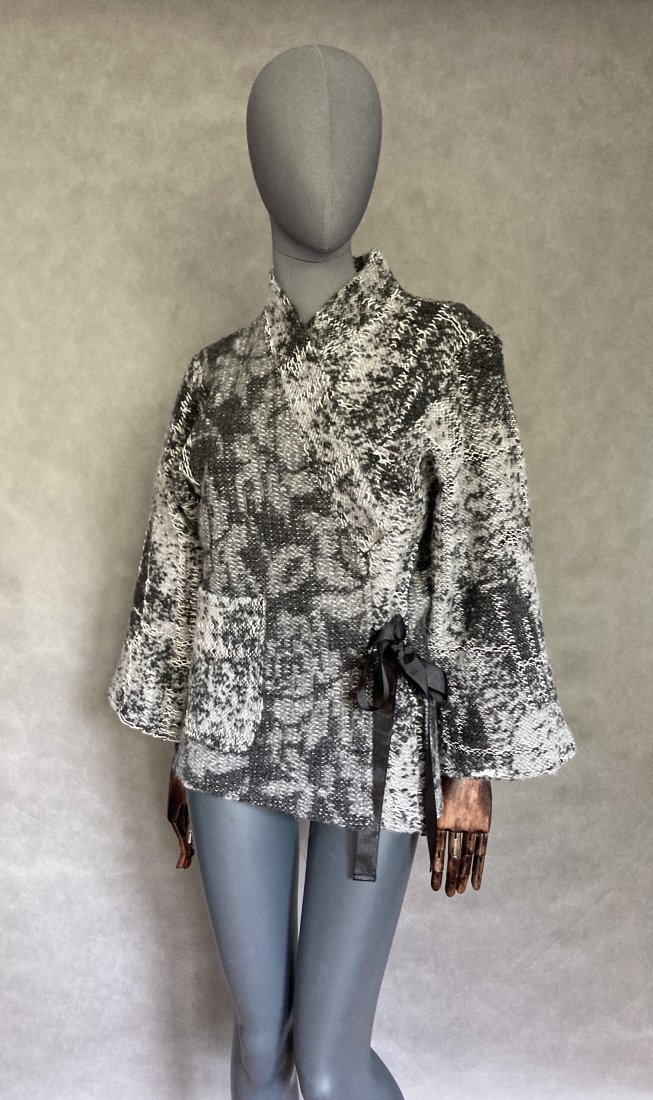 tkanin wełnianych w stonowanych kolorach czarnym, białym i odcieniach szarości. Kimono bez podszewki nonszalancki oversizowy i wygodny fason, wiązane z boku czarną, rypsową wstążką, jedna naszyta kieszeń. Rękawy obniżone, szerokie i wygodne.