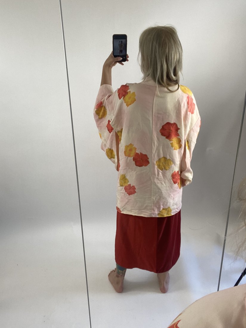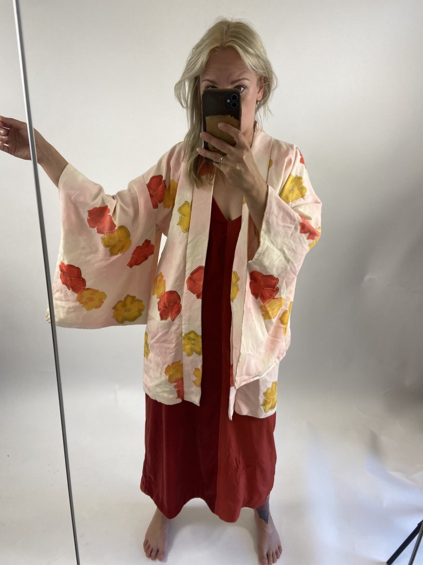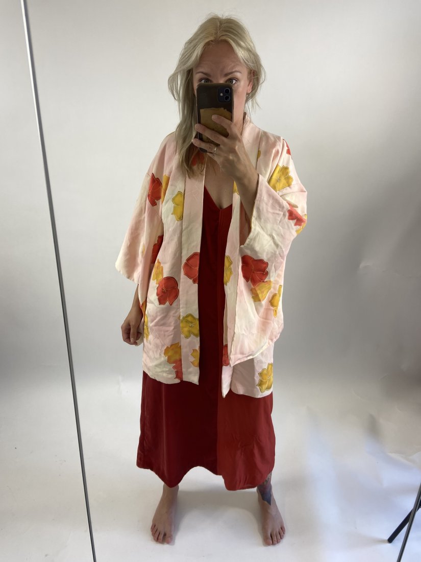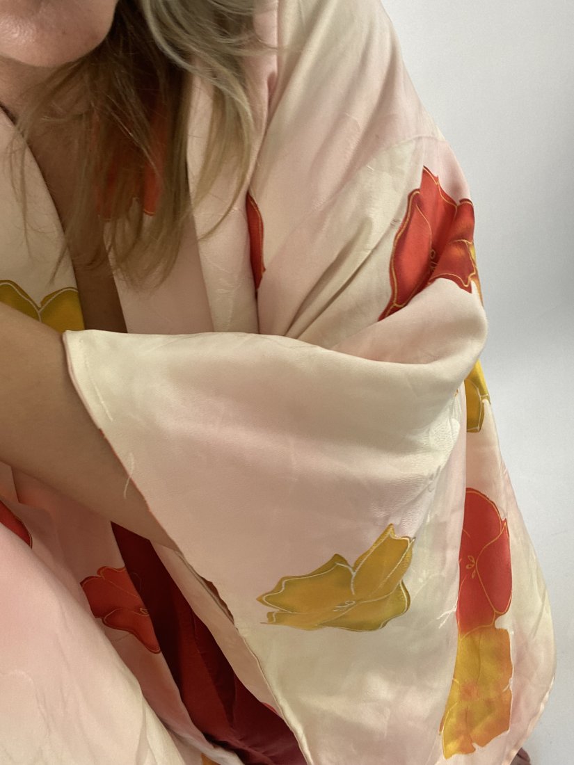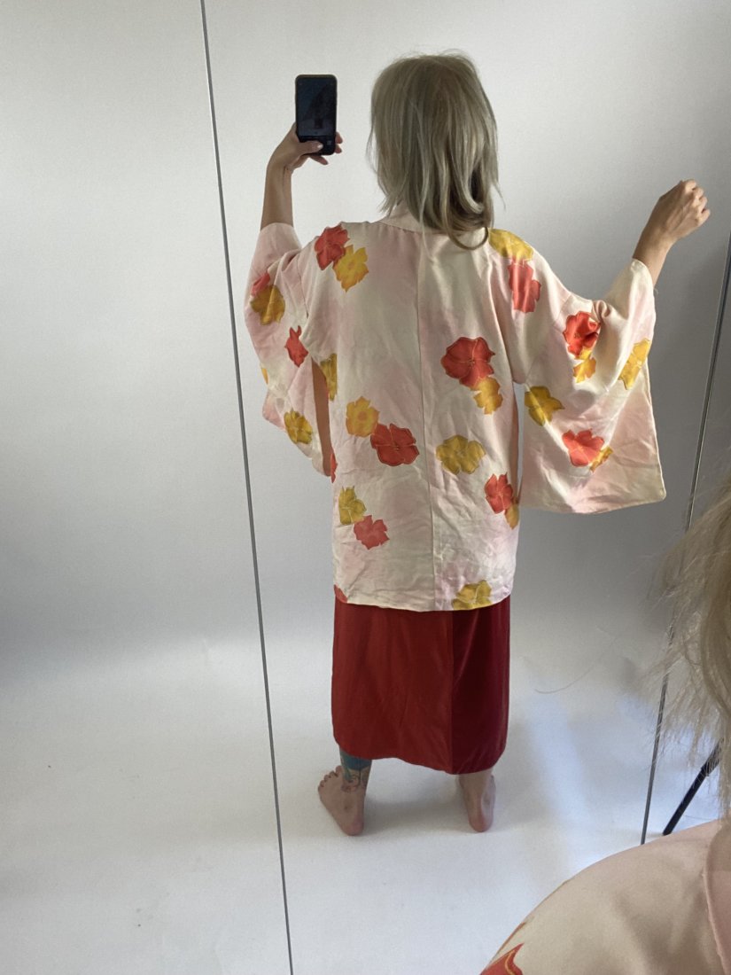 Oryginalne, jedwabne, ręcznie uszyte kimono. W górnej części wszyta podszewka.