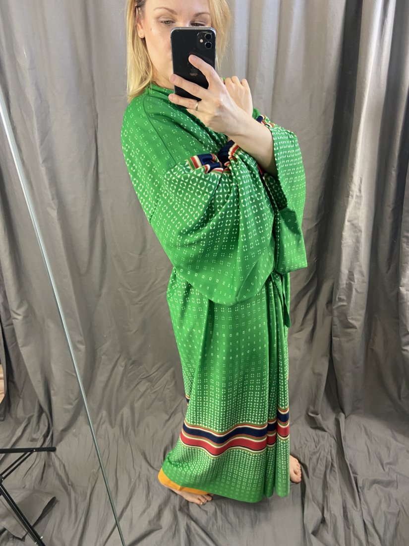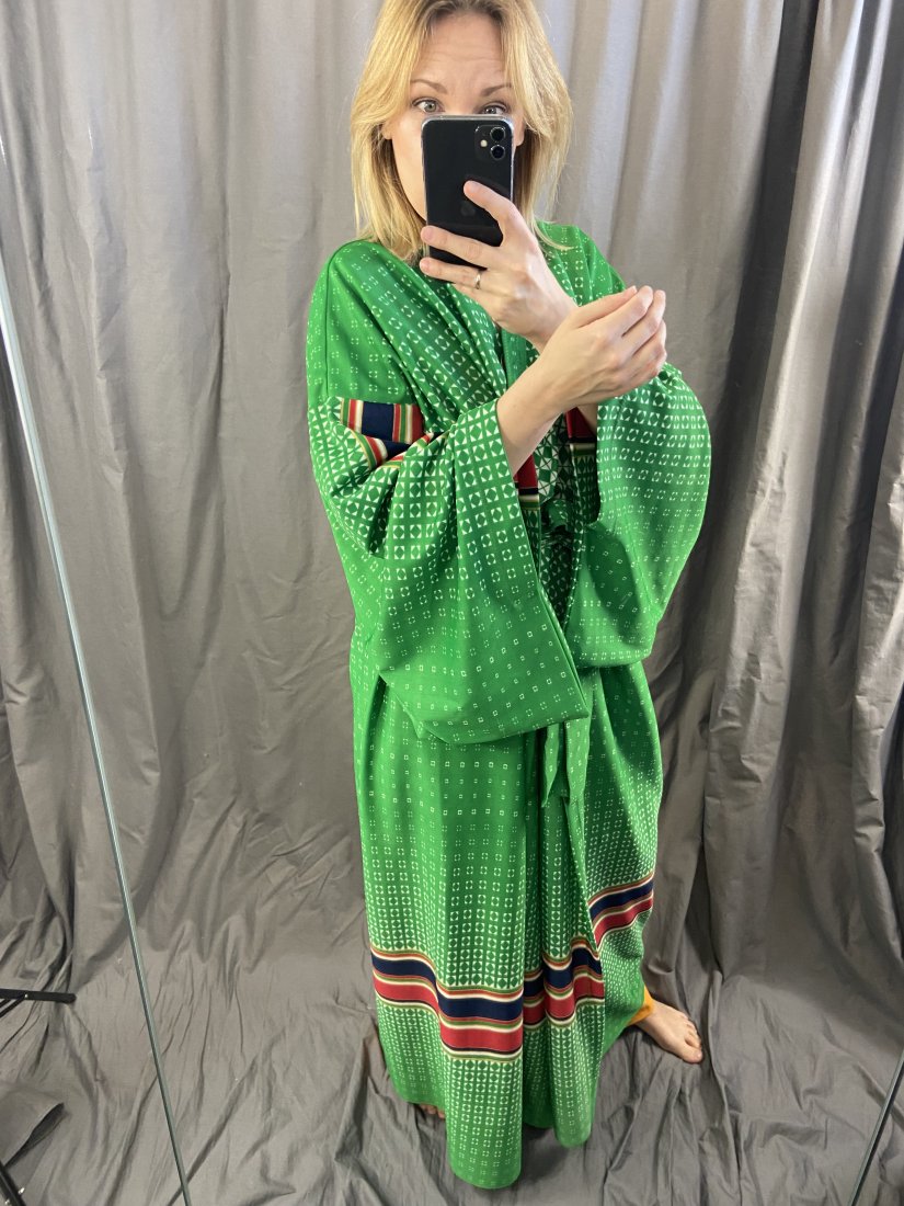 Kimono z lat 70tych, z charakterystycznego dla tamtych lat poliestru (taki jakby piankowy, lekki, miękki).
