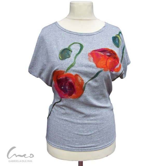 Zmysłowa bluzka o kroju kimona haftowana wełną czesankową z merynosów. Fason który dobrze wygląda na każdym typie sylwetki, tuszuje niedoskonałości a uwydatnia atuty. Materiał: miła w dotyku dzianina 95% wiskoza, 5% elastan. Rozmiar uniwersalny większy - XL XXL. Długość: 66 cm. Prać ręcznie po lewej stronie. Zdjęcie nie oddaje w pełni uroku haftowanych wełną wyrobów.
