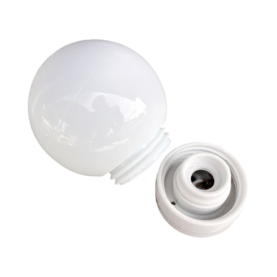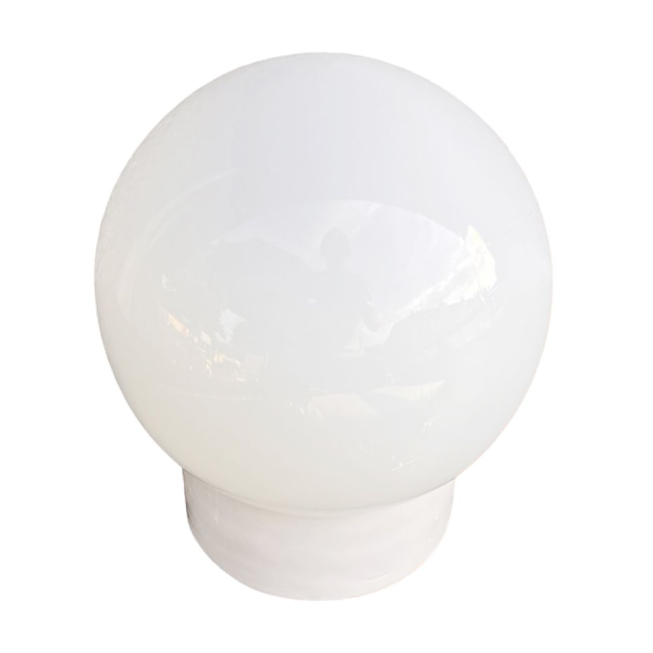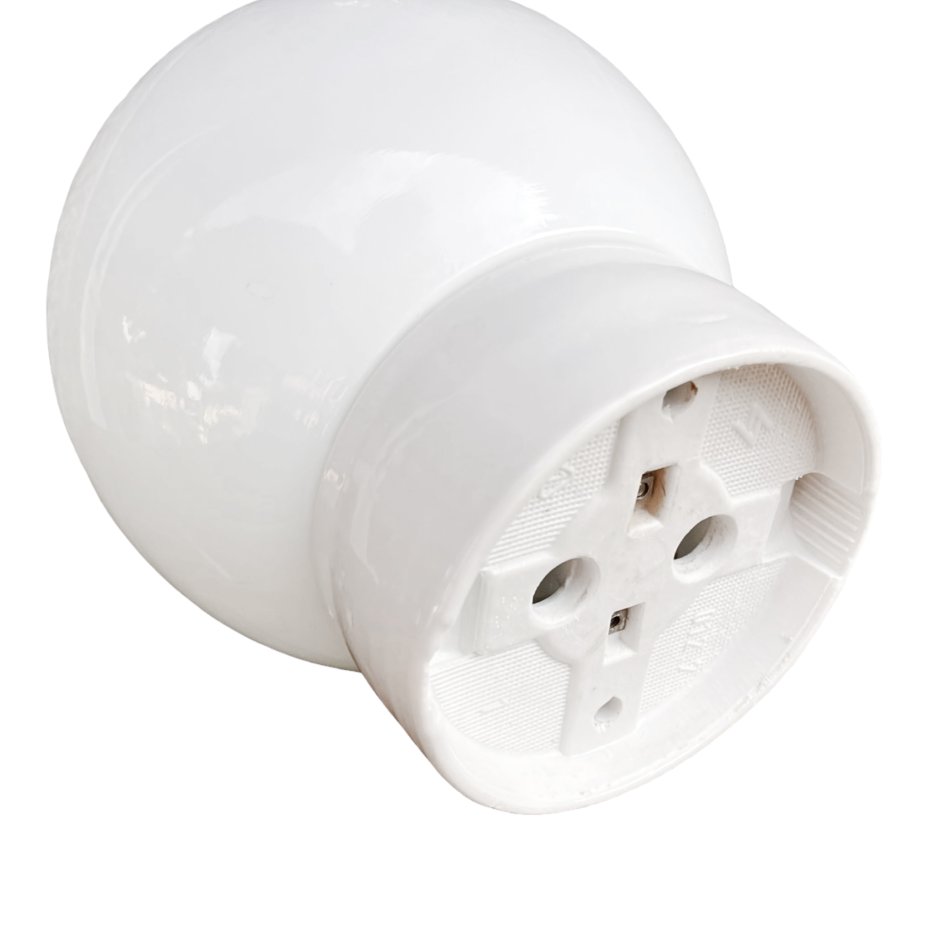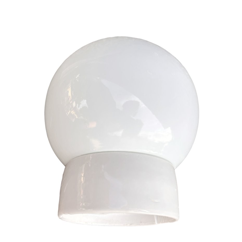 Oryginalny kinkiet ścienny wyprodukowany w latach 60. XX wieku przez Fabrykę Materiałów Światłoczułych FOTON w Polsce. Model ten charakteryzuje się ceramiczną, prostą podstawą oraz dużym kloszem w formie białej, szklanej kuli, typowym dla oświetlenia przemysłowego i użytkowego tamtego okresu.