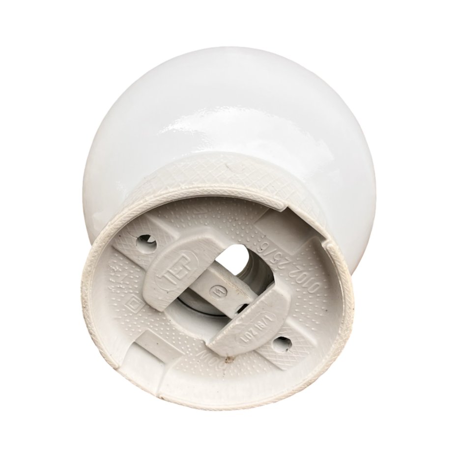 Oryginalny kinkiet ścienny wyprodukowany w latach 60. XX wieku przez Fabrykę Materiałów Światłoczułych FOTON w Polsce. Model ten charakteryzuje się ceramiczną, prostą podstawą oraz dużym kloszem w formie białej, szklanej kuli, typowym dla oświetlenia przemysłowego i użytkowego tamtego okresu.