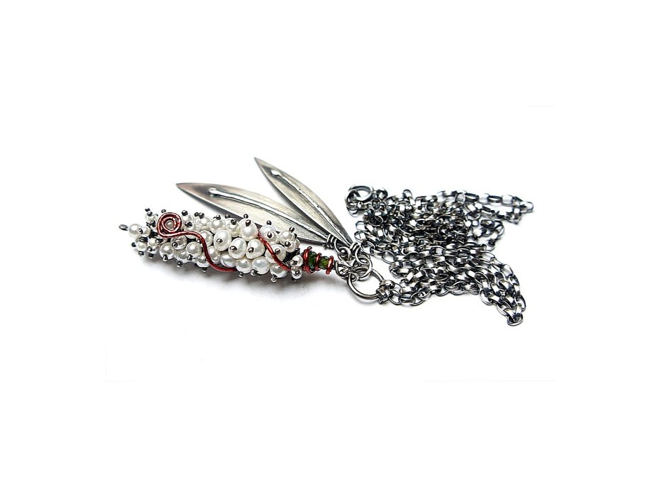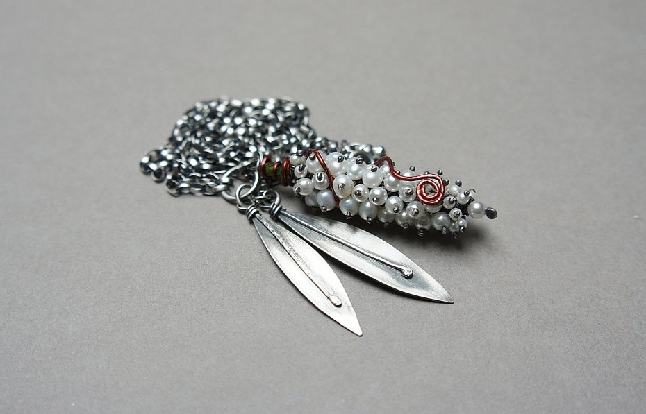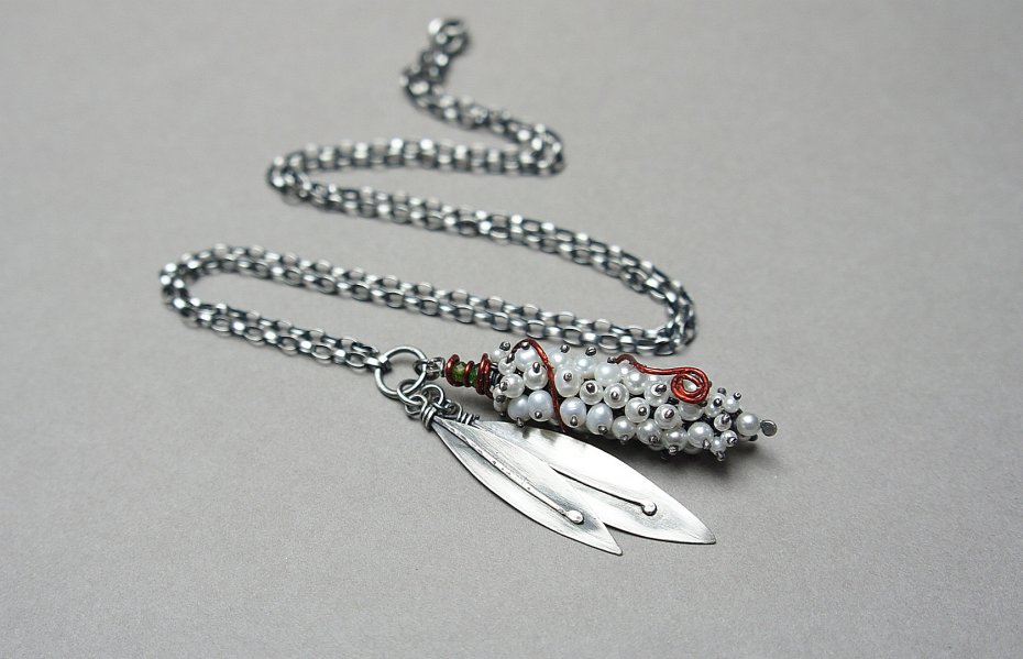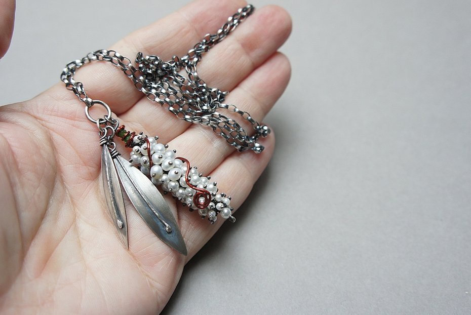 Naszyjnik wykonany własnoręcznie od podstaw ze srebra [pr. 925 i 930 ] w połączeniu z perłami naturalnymi [5mm], perełkami seashell [2mm i 4mm],fasetowanymi diopsydami [4mm i 3mm] .Wielkość perłowego kokonu [50mm] owinięty drutem miedzianym .Wielkość listków około [40mm i 45mm] . Srebro oksydowane i przetarte. Całkowita długość naszyjnika 64,5cm. Biżuteria ozdobnie zapakowana.