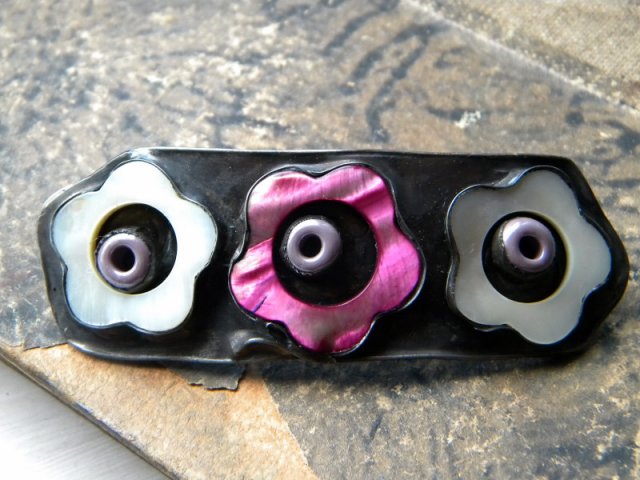 klamra do włosów z masy perłowej i szkła oprawionych w ocynowaną miedz. przedmiot stylizowany na stare srebro. wymiary 8,7cm x 3,1cm. klamra jest lekka.