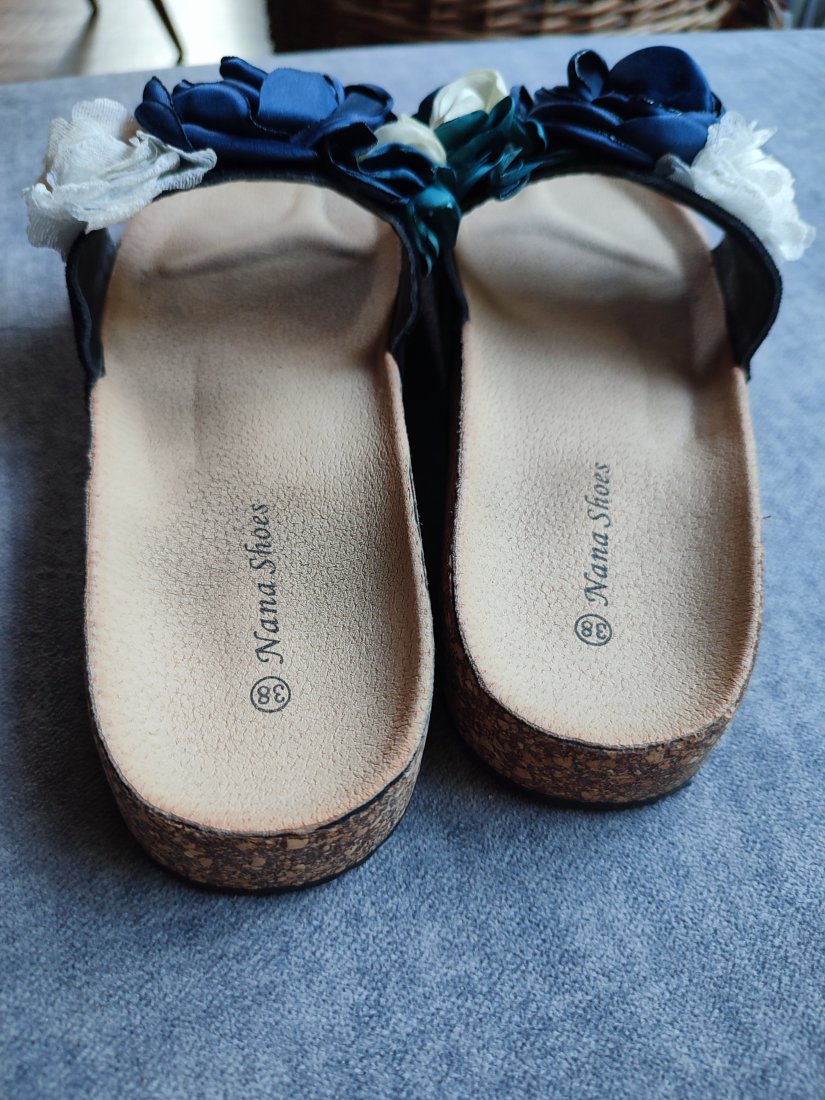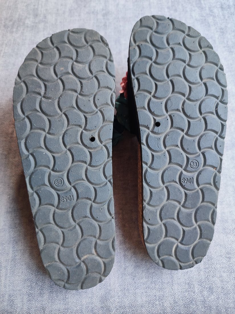 Klapki korkowe ozdobione kwiatami. Gumowa podeszwa. Syntetyczne. Rozmiar 38. Stan dobry, przykurzone podeszwy.