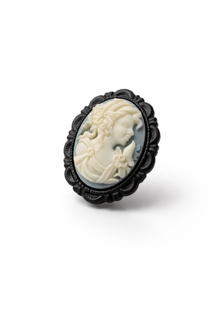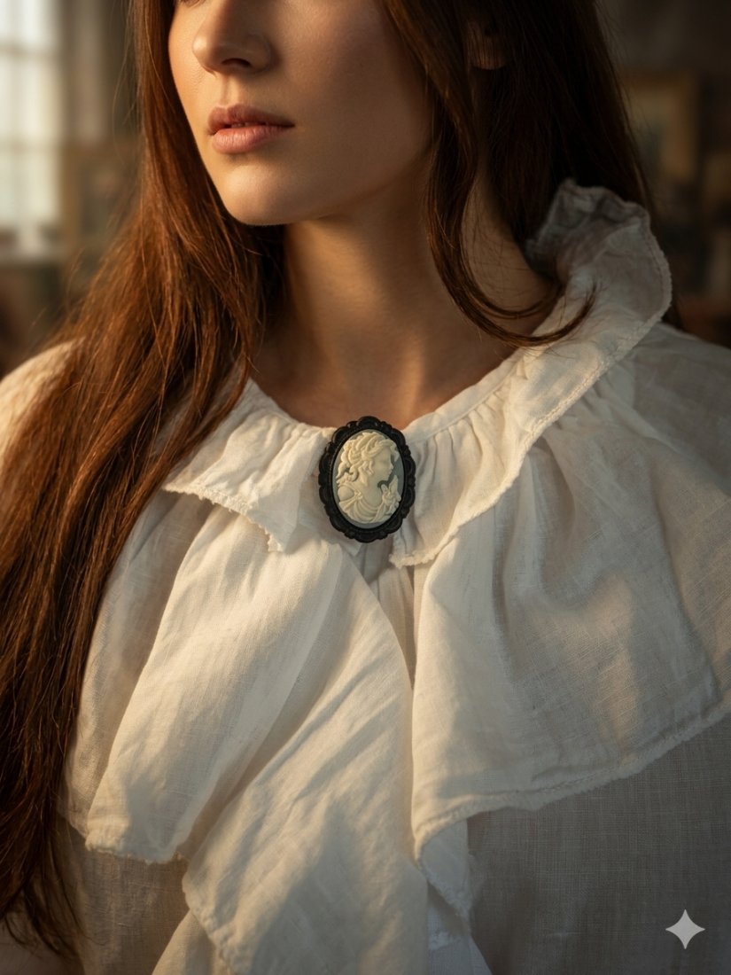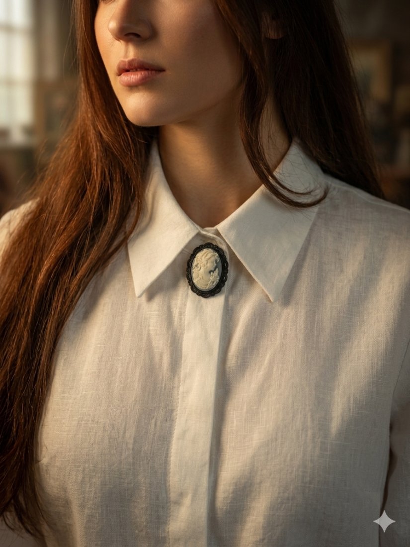Dodaj odrobinę vintage'owej elegancji do swojej stylizacji z tą klasyczną broszką cameo. Przedstawia ona finezyjny, biały profil kobiety na kontrastującym, ciemnym tle, oprawiony w misternie zdobioną, ciemną ramkę. Idealnie komponuje się z białymi koszulami, dodając szyku zarówno codziennym, jak i formalnym zestawom. Ponadczasowy dodatek dla miłośniczek biżuterii z duszą. Broszka mała 3,5 cm