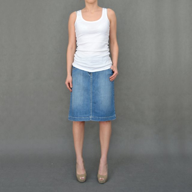 Klasyczna, dżinsowa, prosta spódnica. Kolor bardziej stonowany niż na zdjęciach.