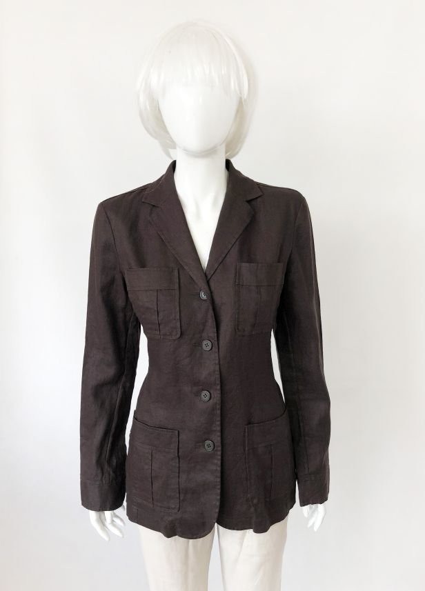 Klasyczna marynarka o dłuższym, taliowanym kroju. Wykonana z lnu w mocnym brązowym odcieniu.