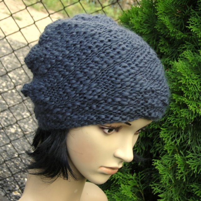 Czapa wykonana ręcznie na drutach z ekskluzywnej włóczki o zmiennej grubości , co daje świetną fakturę (prod. portugalska - 100% wool), ciepła i przyjemna w dotyku, delikatnie elastyczna. Czapka jest bezszwowa i dwustronna. Przepiękny odcień ciemnej stali ! Rozmiar czapki : obwód od 54 do 56 cm, wysokość ok. 26 cm.