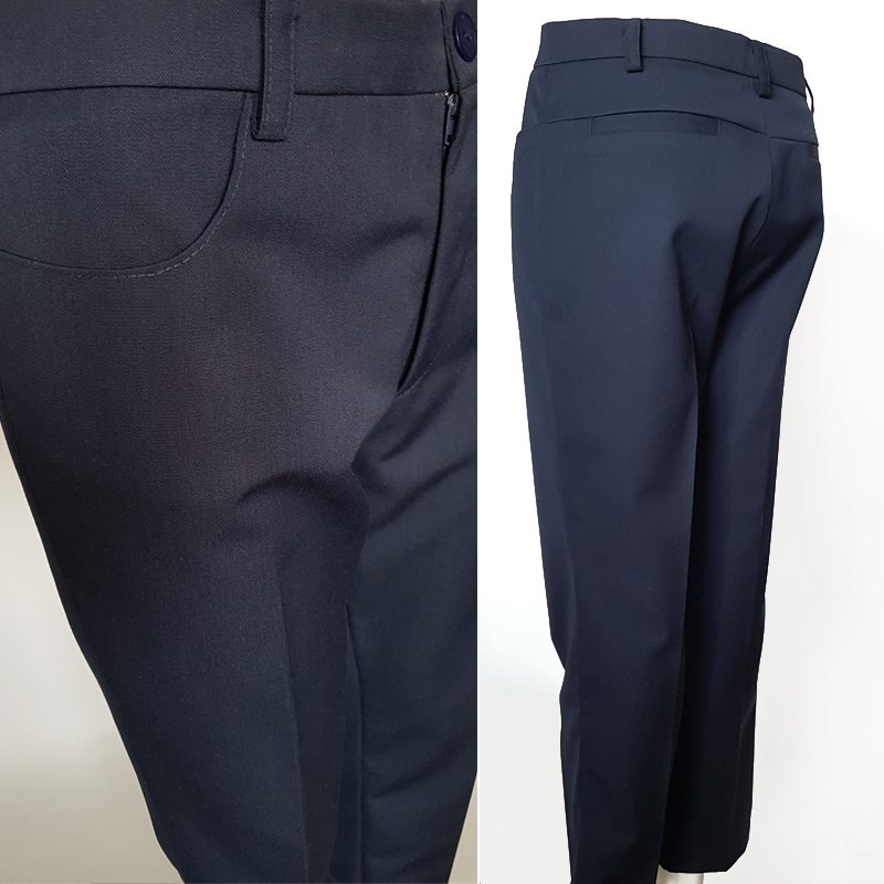 Klasyczne spodnie z kantem, cygaretki o lekko zwężanych nogawkach. Zapinane z przodu na zamek i guzik, w pasie szlufki, 2 kieszenie z przodu, z tyłu listewki sugerujące kieszenie. Spodnie szyte na miarę, z tkaniny wełnianej, z dodatkiem poliestru. Spodnie o kroju unisex, dobrze leżą zarówno na sylwetce męskiej jak i damskiej. Sprawdzą się w zestawach eleganckich i na luzie.