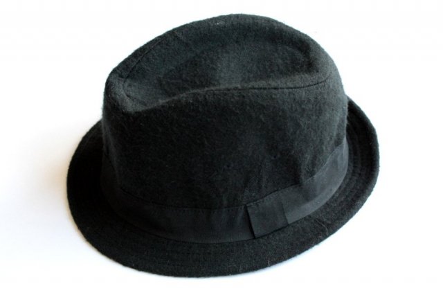Czarny kapelusz z małym rondem, o ponadczasowym fasonie.