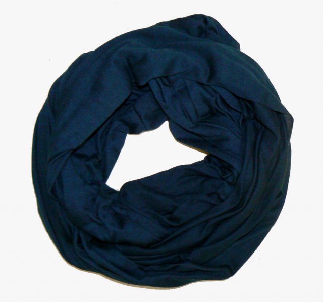Klasyczny duży komin, jednobarwny w kolorze ciemnego granatu. Uszyty prawdopodobnie z bawełny z dodatkiem elastanu. Miękki, lejący material, do dwu- a nawet trzykrotnego owinięcia wokół szyi.