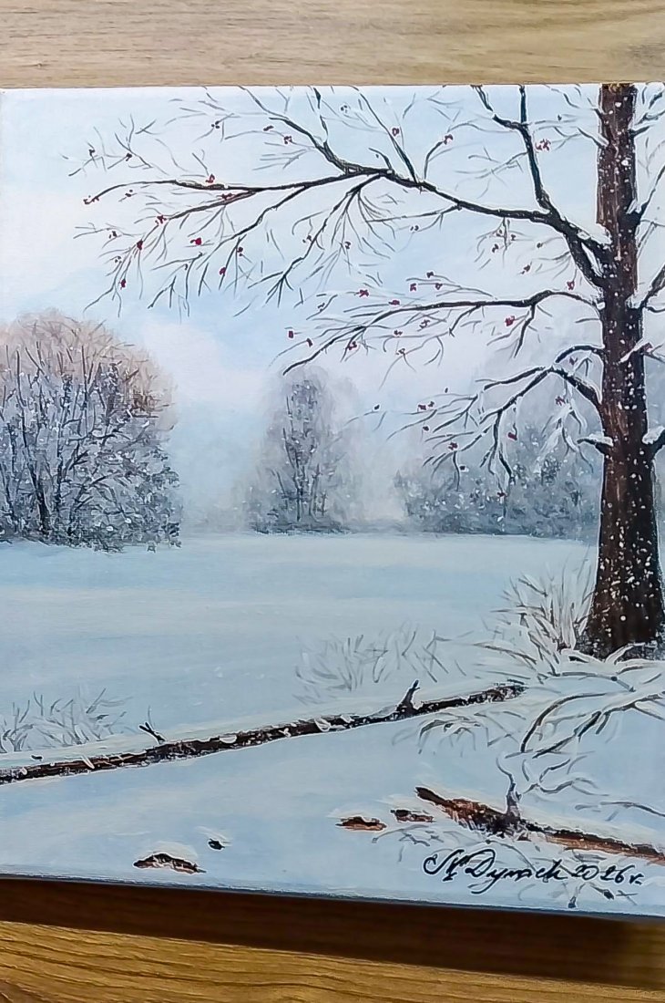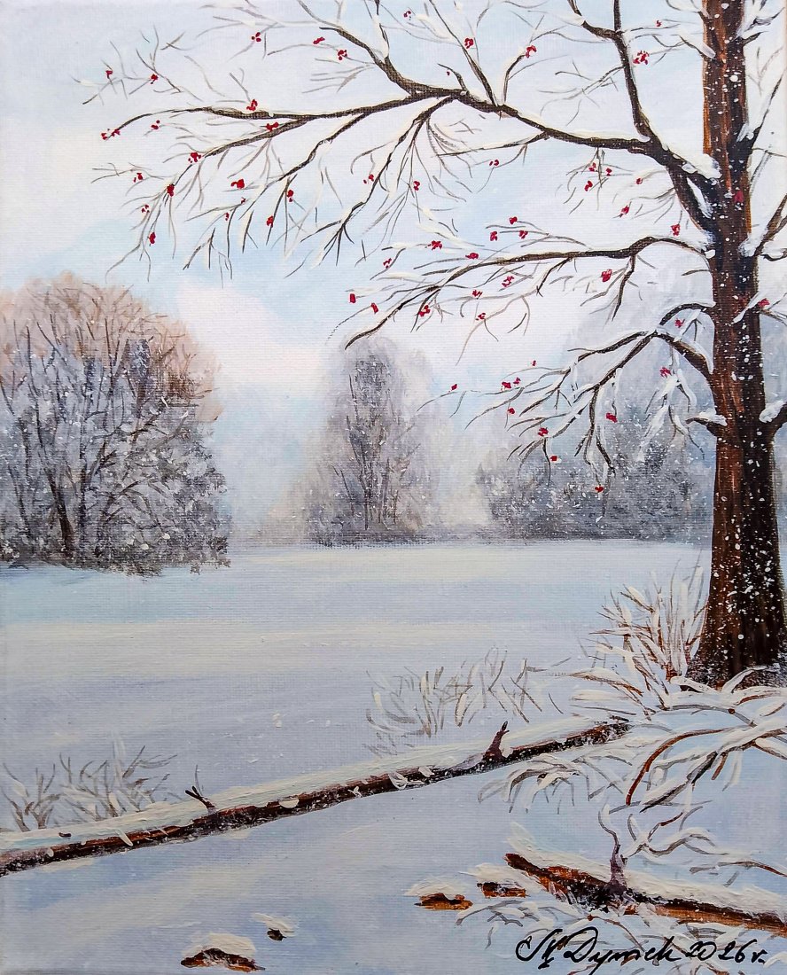 Nastrojowy pejzaż zimowy przenoszący oczami wyobraźni w spokojny, mroźny poranek, gdzie ciszę natury przerywają jedynie nieliczne, barwne akcenty (delikatne, czerwone owoce stanowiące energetyczny kontrast dla mroźnego otoczenia).