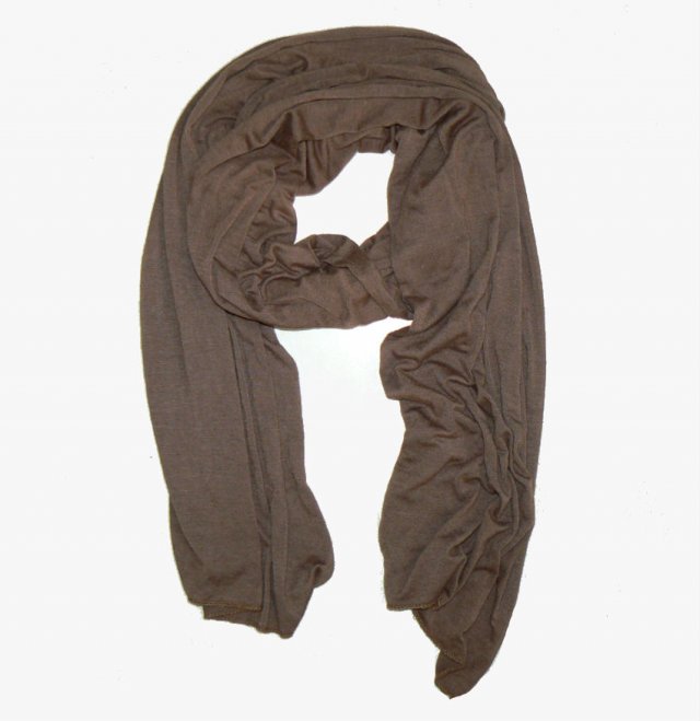 Długi szalik w kolorze kawy z mlekiem. Miękki lejący materiał, bardzo miły w dotyku.