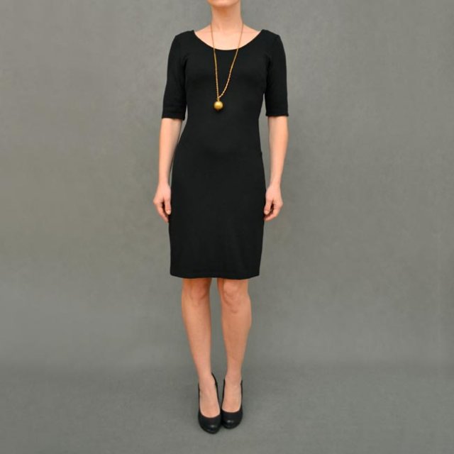Czarna, klasyczna sukieneczka wykonana z dobrej jakości materiału. Lekko elastyczna. Rękawek krótki, dekolt z tyłu i przodu. Polecam.