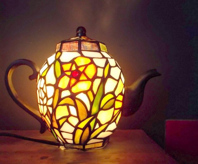Witrażowa lampa - szkło o pięknej, ciepłej, klimatycznej barwie. Od góry dwie dziurki wentylacyjne. Klimatyczna ozdoba kuchni lub salonu :) W komplecie z nowym czarnym kablem o długości 2 mb i żarówką 25 W. Szerokość 22; wysokość 16 cm. Stan zachowania dobry.