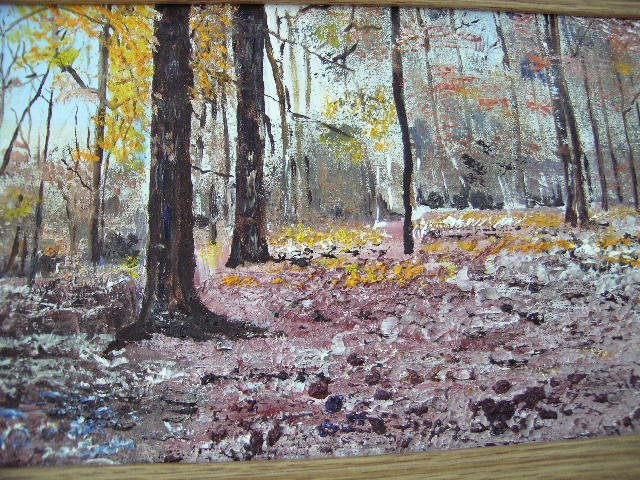 Klimatyczny,olejny obrazek na tekturze. Kliamtyczny,w barwach jesiennych,stonowanych,strukturalny. W drewnianej ramie - gotowy do zawieszenia.