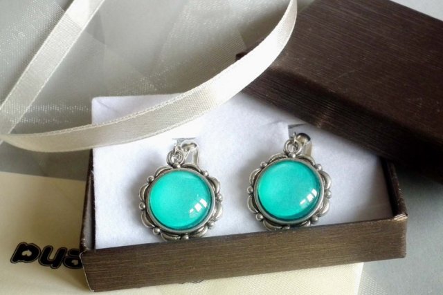 Stylowe, wyjątkowe klipsy ze szklanym kaboszonem w kolorze lazurowym, w oprawie w kolorze srebra. Baza i zapięcie antyalergiczne, posrebrzane. Urocze, nieduże, delikatne klipsy.