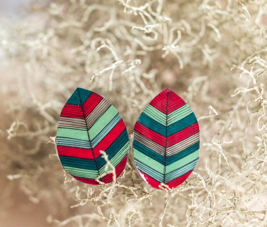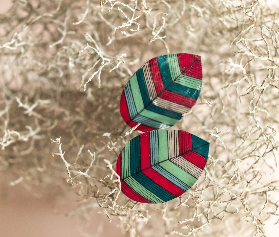 Piękne duże klipsy listki nawiązujące kolorystyką do kolorów lasu: zieleni paproci i bordowo - czerwonej żurawiny.