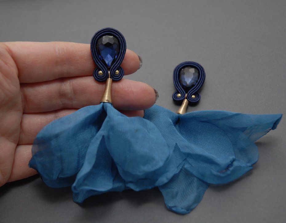 oferuję klipsy zrobione techniką sutasz, ozdobione fasetowanymi kaboszonami i kwiatkami szyfonowymi