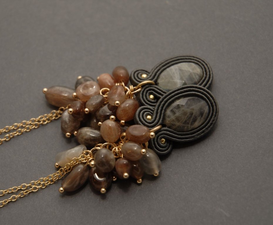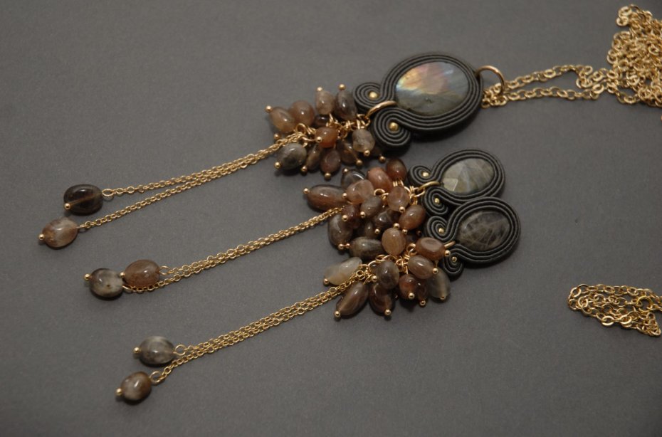 Klipsy zrobione techniką sutasz, ozdobione fasetowanymi labradorytami i drobnymi agatami. Agaty zamontowane są na pozłacanym łańcuszku.