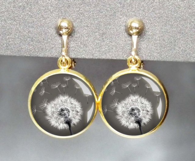 Eleganckie, małe wiszące klipsy z oryginalną grafiką artystyczną, zatopioną pod wypukłym szkiełkiem, w oprawie w kolorze złota. Wypukłość szkła sprawia, że oczko staje się jak trójwymiarowe. Urocze, nieduże, delikatne klipsy. Hipoalergiczne. Zapięcie klipsa jest odchylane, ze specjalnym pokrętłem regulującym docisk do płatka ucha. Szkła z grafiką są unikatowe i ręcznie wykonane, całość wykonana solidnie, z dbałością o detale, dlatego klipsy te są jedyne w swoim rodzaju i niepowtarzalne.