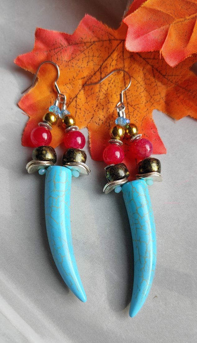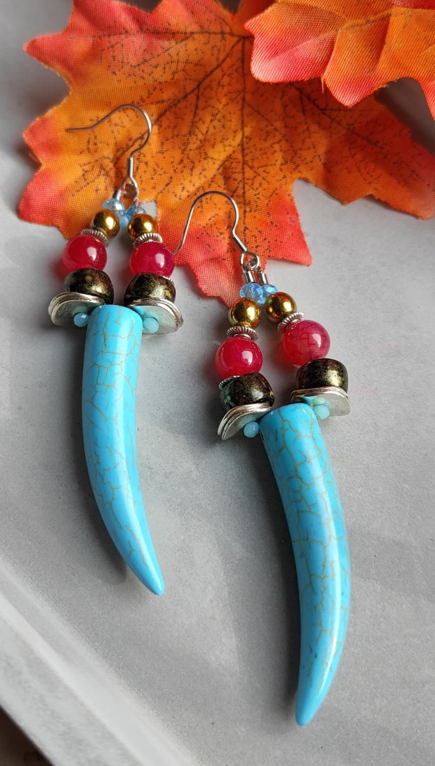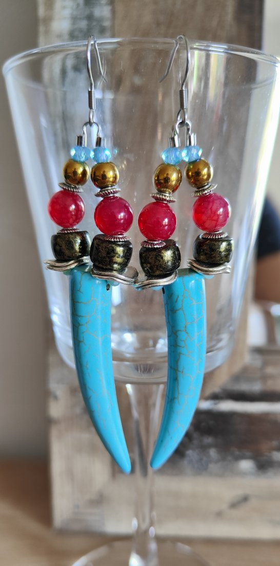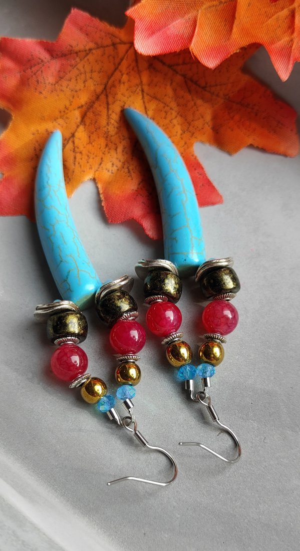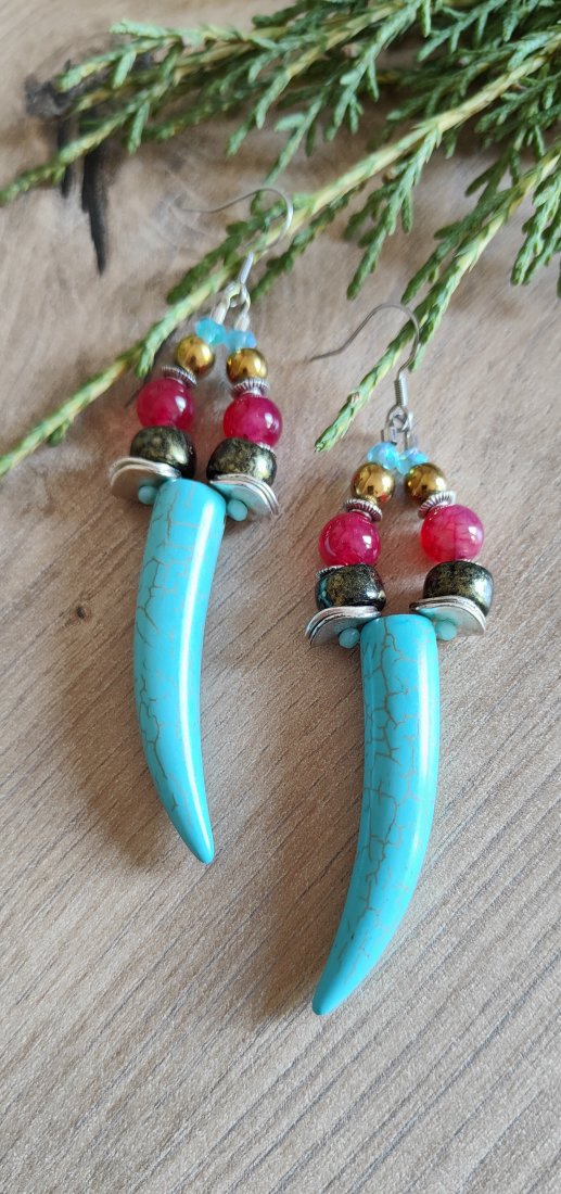 ,, kły,, to wiszące kolczyki wykonane z howlitu w kształcie kła, różowego turmalinu, złotego hematytu i metalowych elementów w kolorze srebrnym. Kolczyki zawieszone są na klasycznych biglach wykonanych ze stali szlachetnej.