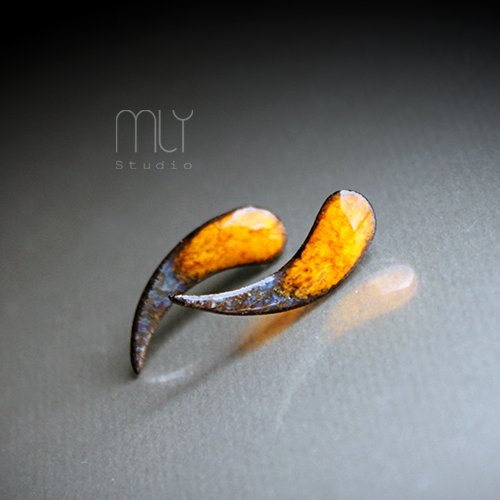 Ceramiczne podłużne kolczyki, ręcznie wykonane z delikatnej gliny kamionkowej, jednostronnie szkliwione mieszanką pomarańczowych i szarych szkliw z efektem plamek, tył matowy czekoladowobrązowy na antyalergicznych sztyftach.długość ok 2,8cm. Polecam