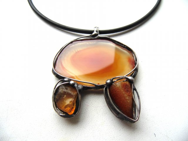 Wisiorek wykonany techniką witrażową z agatu i surowych bursztynów. Zawieszony na czarnej lince kauczukowej o długości ok. 45 cm. Wymiary max ok. 5 na 5 cm.
