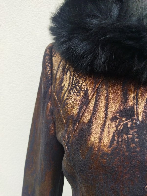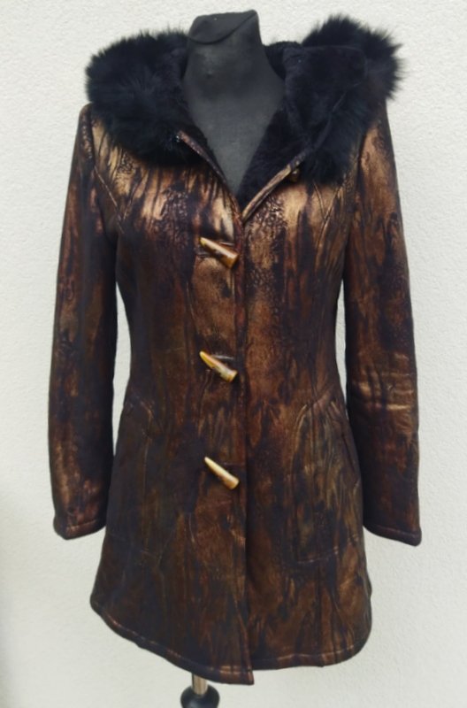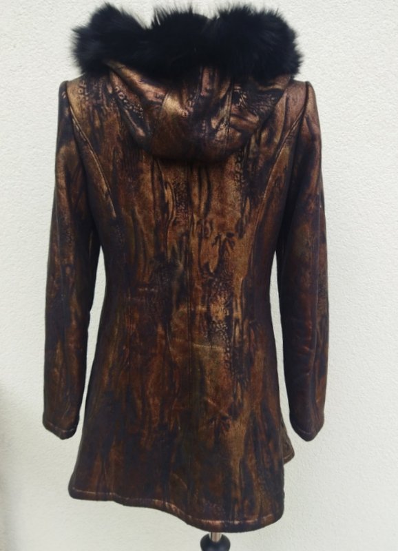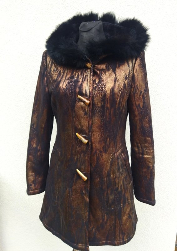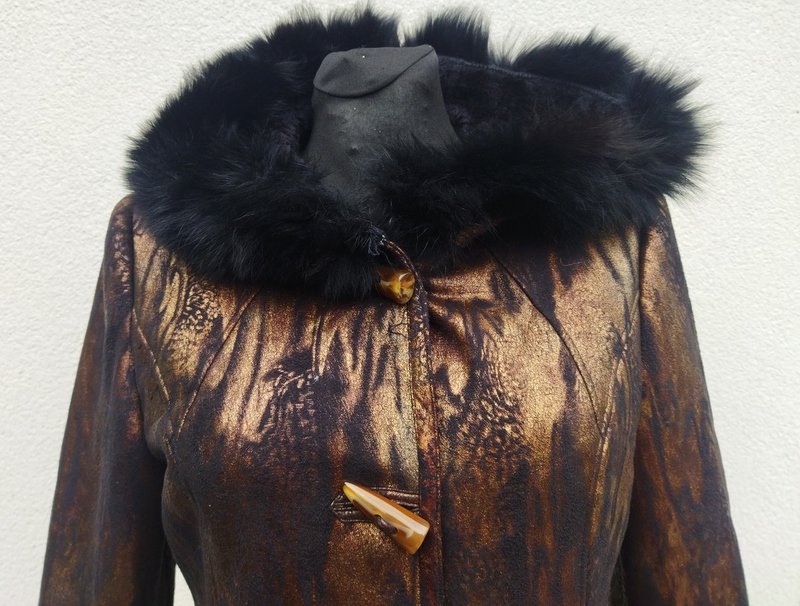 Zgrabny ładny kożuszek ze sztucznego zamszu w metalicznej czarno-złocistej kolorystyce od środka czarne sztuczne futerko. Z kapturem obszytym naturalnym czarnym futerkiem. Z dwiema wpuszczanymi kieszeniami. Zapinany na kołki. Wygodny i bardzo lekki.