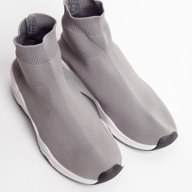 High socks sneakers, stylowe, super wygodne buty sportowe a'la Steve Madden czy Balenciaga. Unikalny fason święcący triumfy na wybiegach, łączy w sobie wygodę i oryginalny wygląd. Wykonane z przyjemnej, elastycznej szarej dzianiny dopasowującej się do stopy, dzięki której buty oddychają. Gruba gumowa podeszwa optycznie wydłuża sylwetkę. Cholewka z dzianiny jest stabilizowana na czubkach i na zapiętkach. Buty wyglądają bardzo zgrabnie, idealne zarówno do sportowych stylizacji jak i do przełamania klasycznego looku, w zestawieniu ze spódnicą z koła, czy płaszczem. Must have.
