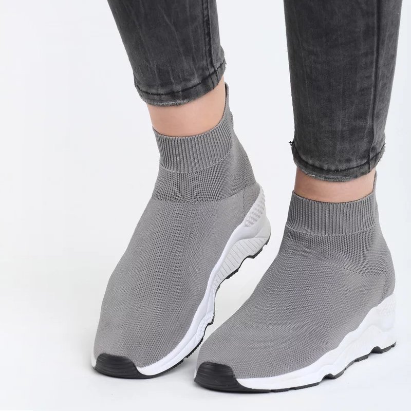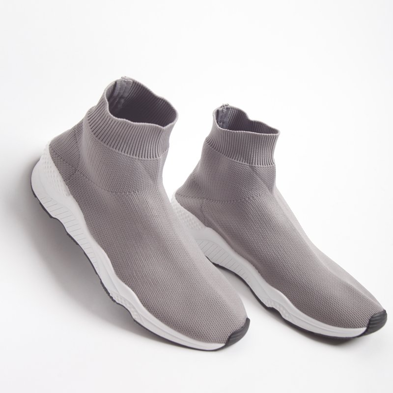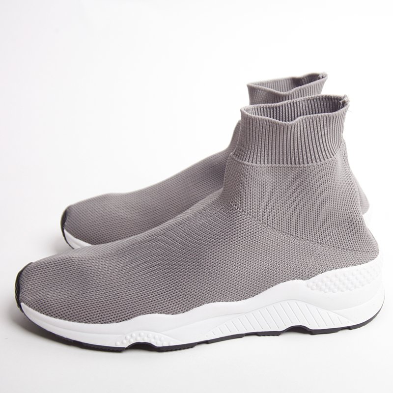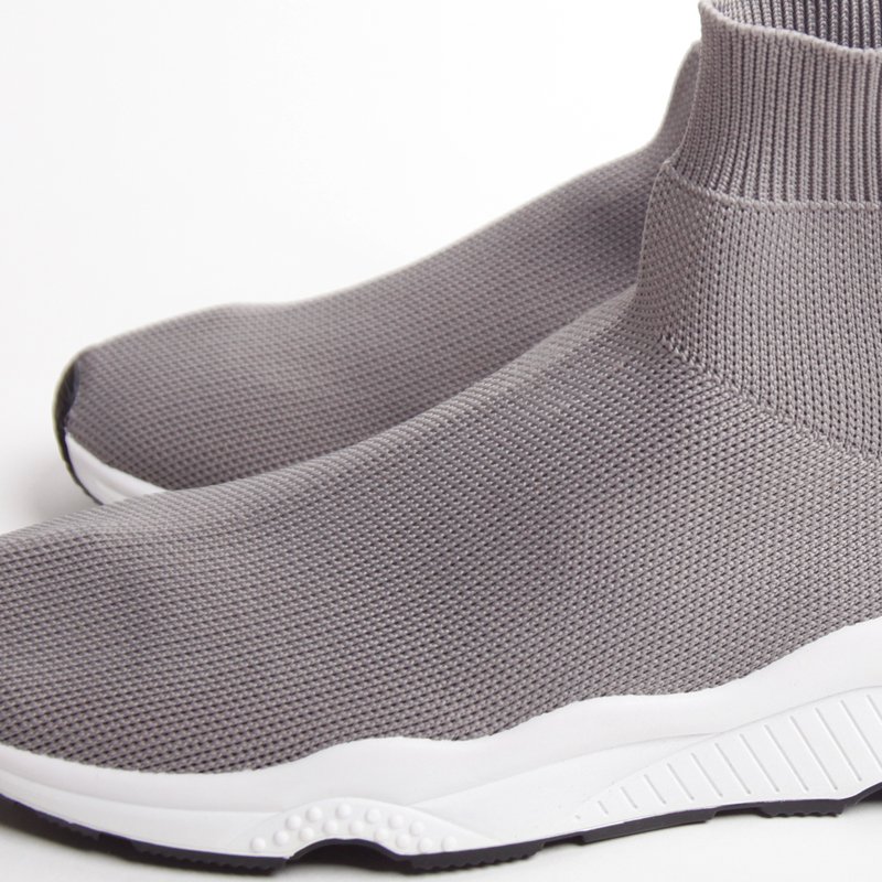 High socks sneakers, stylowe, super wygodne buty sportowe a'la Steve Madden czy Balenciaga. Unikalny fason święcący triumfy na wybiegach, łączy w sobie wygodę i oryginalny wygląd. Wykonane z przyjemnej, elastycznej szarej dzianiny dopasowującej się do stopy, dzięki której buty oddychają. Gruba gumowa podeszwa optycznie wydłuża sylwetkę. Cholewka z dzianiny jest stabilizowana na czubkach i na zapiętkach. Buty wyglądają bardzo zgrabnie, idealne zarówno do sportowych stylizacji jak i do przełamania klasycznego looku, w zestawieniu ze spódnicą z koła, czy płaszczem. Must have.
