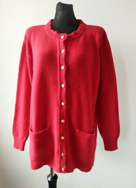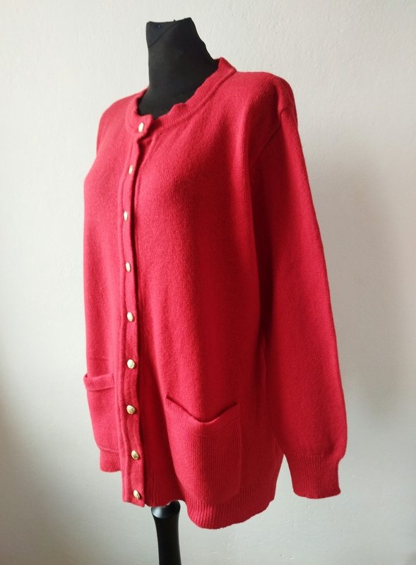 Dobrej jakości rozpinany sweter typu kardigan w kolorze nasyconej czerwieni. Z dwiema naszywanymi kieszeniami. zapinany na ozdobne grawerowane guziki w złotym kolorze. wykończony ściągączami
