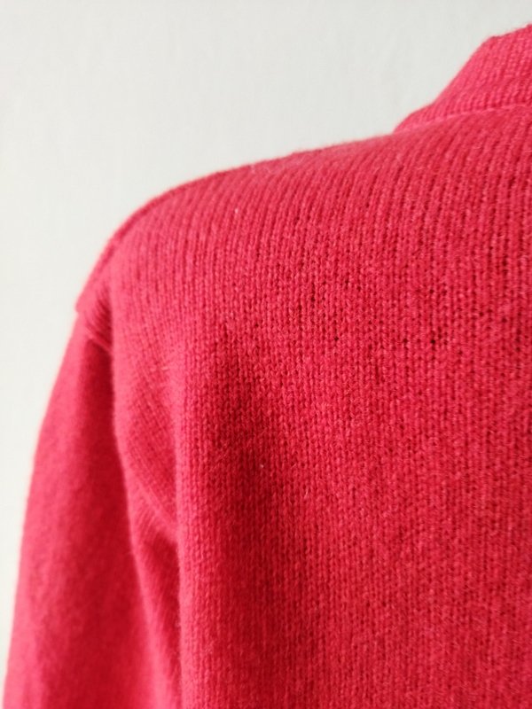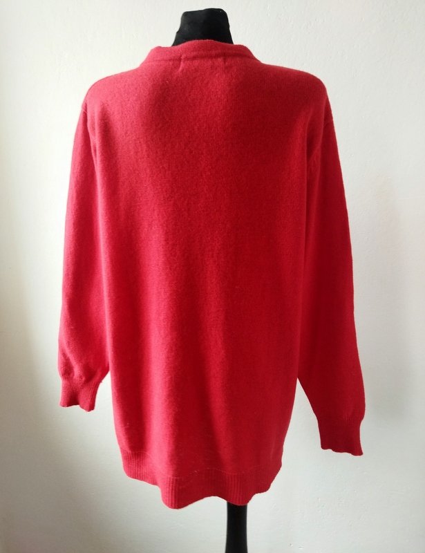 Dobrej jakości rozpinany sweter typu kardigan w kolorze nasyconej czerwieni. Z dwiema naszywanymi kieszeniami. zapinany na ozdobne grawerowane guziki w złotym kolorze. wykończony ściągączami